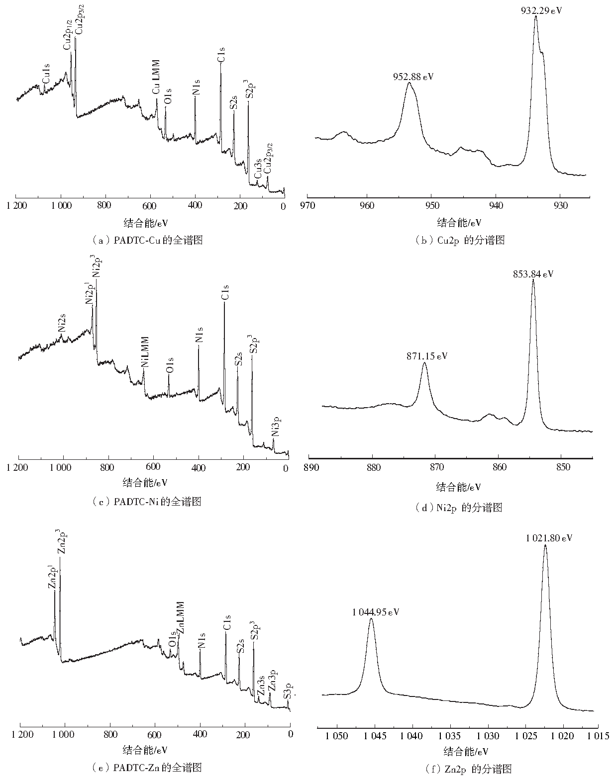 PADTC抓捕重金屬后沉淀PADTC-Cu、Ni和Zn的XPS如圖7所示。Cu1s的高分辨光譜位于1 070.79 eV處,Cu2p1/2、Cu2p2/3和Cu3p2/3的峰分別在952.88、932.29和77.02 eV,如圖7(a)和圖7(b)所示。S2s和S2p3的結(jié)合能分別位于227.70和162.83 eV處,由此可以推斷出S一Cu的存在[24]。Ni3p的高分辨率光譜位于66.22 eV,分別在871.15和853.84 eV處觀察到Ni2p1和Ni2p3的峰,如圖7(d)所示,因此證明了Ni2+的存在。此外,S2s和S2p3的結(jié)合能位于227.26和160.79 eV,這表明PADTC-Ni沉淀中存在S一Ni鍵。Zn2p的高分辨率光譜如圖7(f)所示,在1 021.80 eV(Zn2p3/2)和1 044.95 eV(Zn2p1/2)處,表明沉淀PADTC-Zn中Zn2+的存在,S2s和S2p3的結(jié)合能分別位于227.30和160.81 eV處,這表明沉淀中S—Zn的存在。531.80 eV處的O1s的峰值表明,可能是因為沉淀暴露在空氣中被氧化一部分,從而有O1s 的峰的出現(xiàn)。
