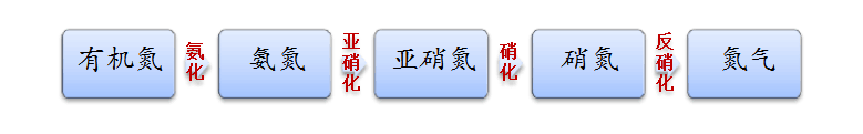 第二,利用微生物硝化和反硝化去除廢水中的氨氮,其原理是硝化菌和反硝化菌的聯合作用,將水中氨氮轉化為氮氣以達到脫氮目的。首先通過硝化細菌和亞硝化細菌將氨氮轉化為亞硝酸鹽和硝酸鹽,然后再進行反硝化,將硝酸鹽轉化為氮氣。其反應原理圖如下所示: